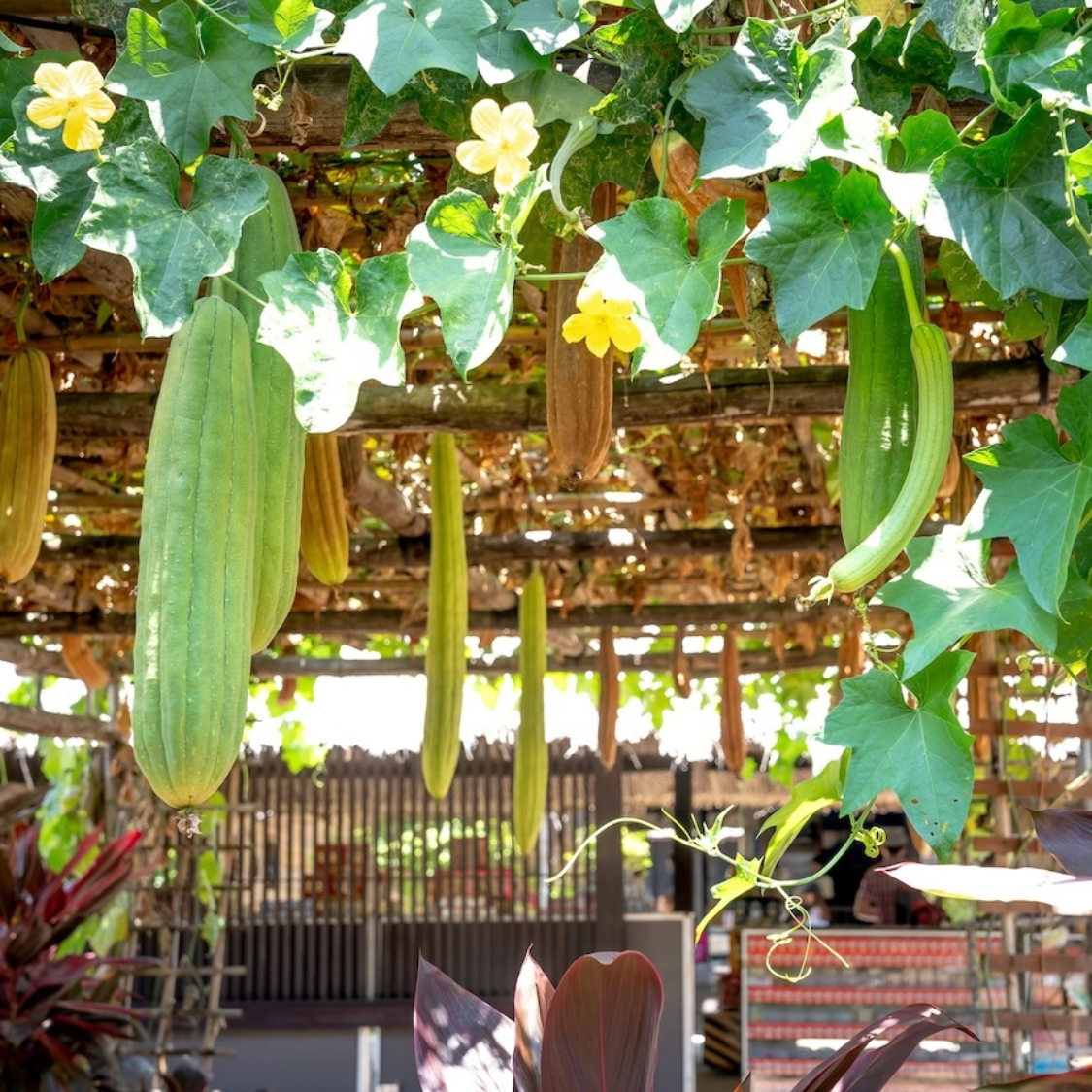 Luffa plants are in the edible gourd family along with cucumbers and melons. Its unique fibrous exoskeleton has been used as natural scrubber sponges for centuries.